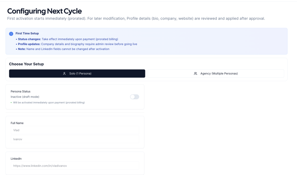 First, you’ll fill in your profile information. This isn’t just basic contact details—the AI needs to understand your expertise, your company, and your unique value proposition. I added: