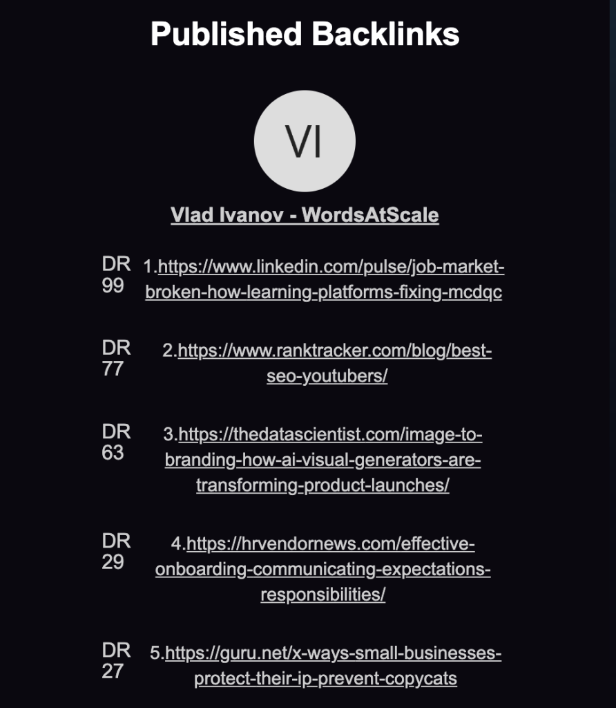 The tool delivers exactly what it promises: high-quality backlinks from reputable websites with genuine domain authority, completely hands-off. I went from DR10 to DR17 in one month, secured a backlink alongside SEO legends like Neil Patel, and saved 40+ hours of manual work.